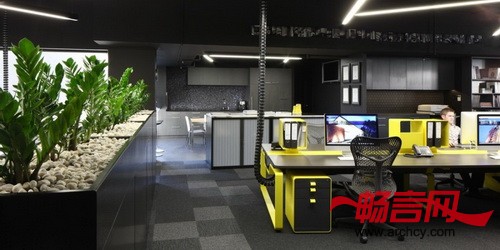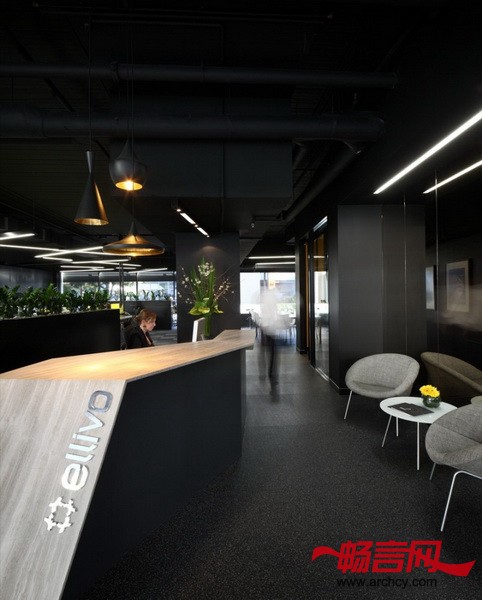 该办公空间在一个高层建筑的一层,几乎全部是黑色色调,只有星星点点的黄色和材料本身的颜色。设计小组希望装修后的办公空间既能让员工喜欢,又能让客户印象深刻,同时宣告该公司的主营业务。利用办公空间的外壳,他们介绍了该公司的服务和作品。同样,办公室开放的设计也是在向人们展示着自己,也在欢迎客户和顾问成为事务所环境中的一部分。