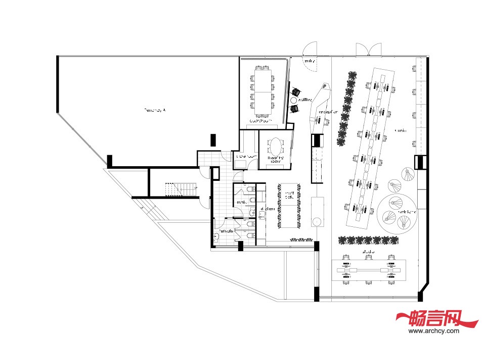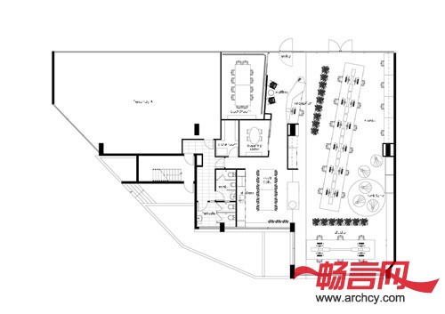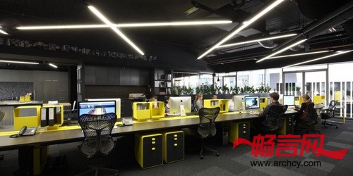 设计师没有用不必要的材料去掩盖建筑骨架;办公空间里面的整体布局,如果有需要的话,还可以根据随意安排的之字形吊灯再次进行划分。