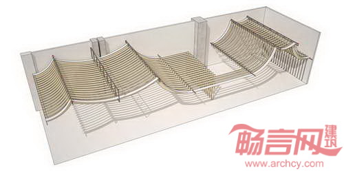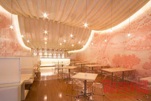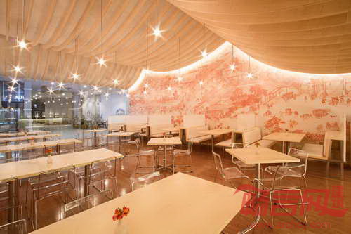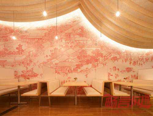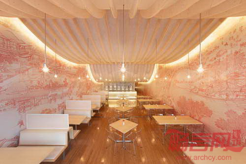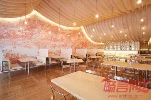 快乐熊猫餐厅位于厄瓜多尔基多市Cumbaya区的三藩购物中心内,室内设计基于传统的中国艺术和建筑。餐厅墙壁上添加了闻名遐迩的“清明上河图”的画卷图案。起伏的天花板形成寺庙屋面形状,是由数控切割胶合板和重物界面组成的,该材料是使礼服和西装面料坚挺的织物。餐厅天花板流畅连续,从较高位置的餐厅区和较低的服务区之间平滑过渡。游览餐厅,人们可以经历扩展和压缩的空间体验。主餐厅和更私密的小餐厅由中央酒吧和服务区分开。为了扩大座位区并提供足够的空间,项目将厨房提升至夹层空间。