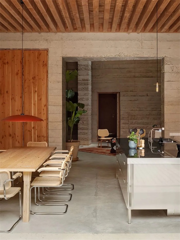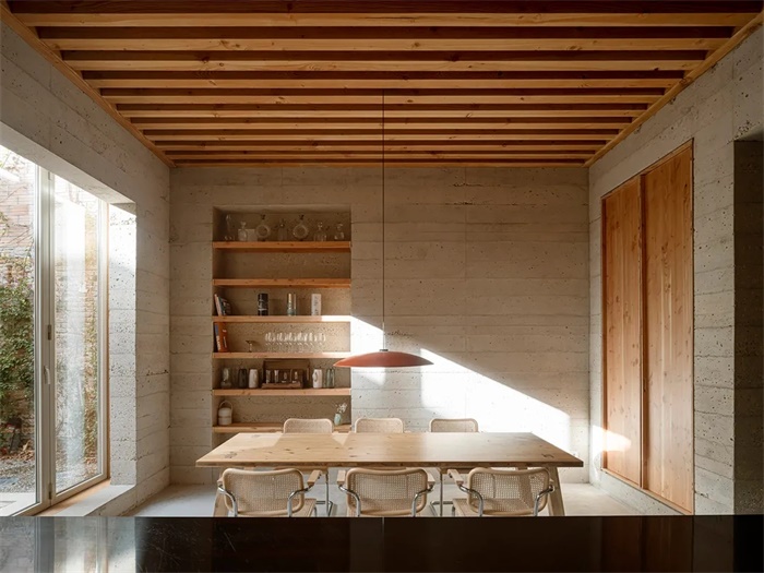 房屋中心被转化成一个与外界联系更加紧密,充满自然光线,为整栋房子提供通风的空间。这是一个介于室内外之间的过渡空间,从屋顶上引入自然气候,并将房屋划分成两半,使其空旷、宽敞并能“呼吸”。这个空间凭借其高度、采光和通风,给人带来一种置身室外的感觉。竖向的通高和天顶开窗组织了光线和空气,照亮中庭底部并加快了空气循环速度,促进热空气向上排出。