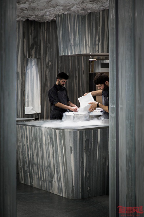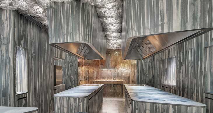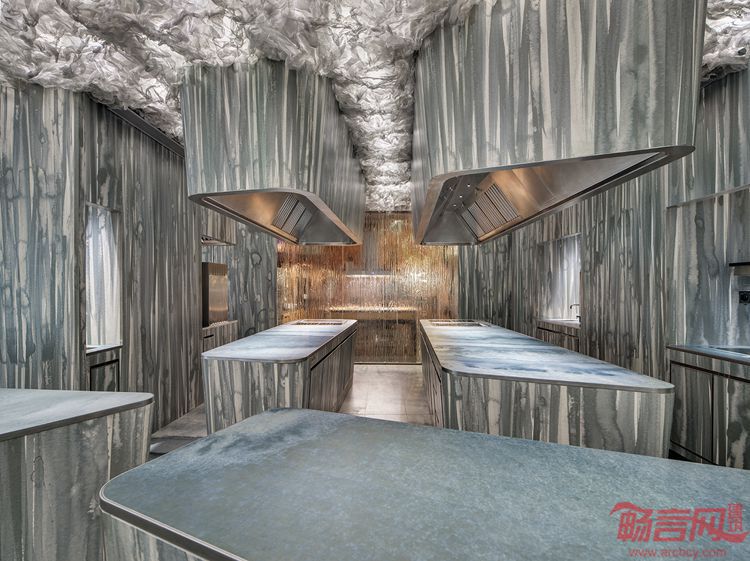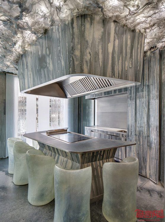 RCR工作室构想了巴塞罗那“谜”餐厅。作为2017年普利茨克奖得主,RCR同知名加泰罗尼亚大厨Albert Adria合作,营造了“冷冻和谜情”的餐厅室内设计。Adria是一位以创意菜单和实验烹饪著称的厨师,他用了三年时间策划这一项目,希望创造一个能反映其前沿美食主义的背景环境。他认为,我们提供的美食类型由空间种类决定,例如,如果置身于自然中,我们就要做完全不同的食物。
