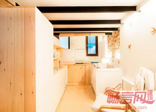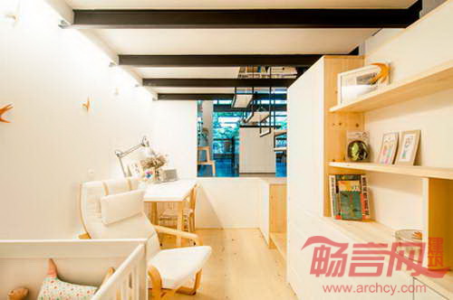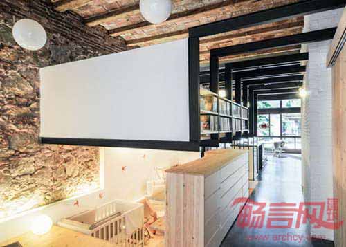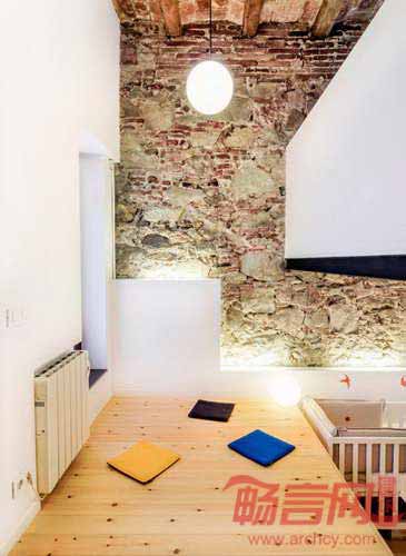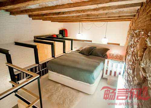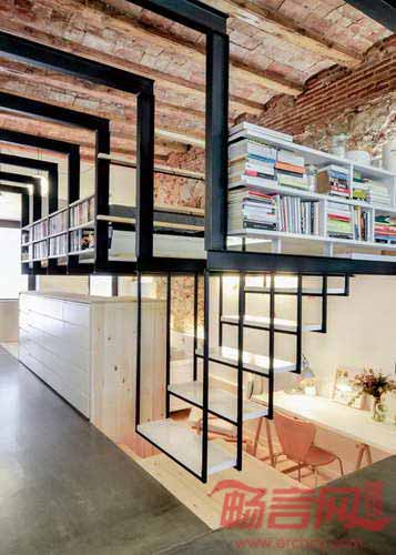 建筑师Carles Enrich将巴塞罗那Gracia区一所旧洗衣房改造成公寓,其中一大特点是书架和楼梯功能的融合。项目将原先的单一楼层改造成三层空间,修复了毁坏的地下层,将其转换成一套单房公寓。设计师表示,“这个项目设计过程中,我们认真思考了废弃空间的利用和优化可能。”为了营造更多的使用面积,狭窄布局中的西南侧被设置成书房和儿童房。在此之上,设置了一个由I形金属桁梁支撑的挑高卧室。除西南侧外的侧面连接夹层空间的边缘,容纳了书架和较低的隔断。