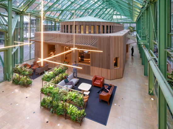 项目的挑战在于优化这些空间的多功能性,重点在于促进互动、协作与联系。此次改造的核心是引人注目的温室大厅(Orangerie)—— 一个充满绿意的空间,将两座现有的小空间及其周边区域重新构想为让人置身自然的、生动的交流场所。