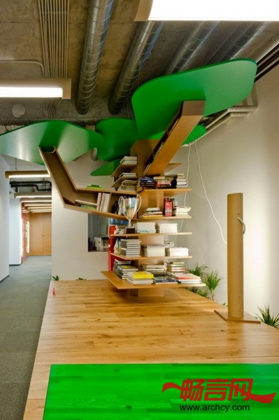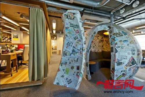 室内空间设计为回收再利用风格。四楼的墙体和镶嵌板采用其它项目剩下的木材和回收利用的家具和办公用品建造而成。灯饰采用大直径的纸板管制成,这种纸板管常用于各种面料的卷轴。“作为一个低预算项目,我们采用简单的材料,打造了一个具有“垃圾桶风格”的办公空间。” Open AD的设计师说。