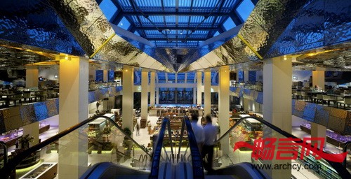 从一楼一进门人们就能看到这个不锈钢天花板,它与百货商场大楼的室外建筑相互呼应。从一进门,天花板就吸引着人们往上看,形成一种别样的购物体验。