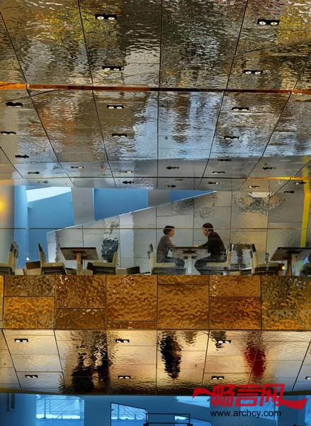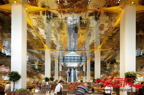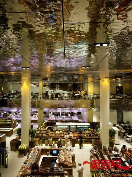 设计师用一个非常宏大的不锈钢悬挂天花板与市场的外部轮廓联系起来,把室内的几层空间都围起来。高度抛光的不锈钢天花板将产品和购物者映射在上面,天花板的样式是不一样的,再加上反射来自窗外和天窗的光线,这就形成了不同的影像。