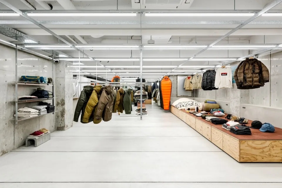为了有效地展示睡袋这一核心品牌形象,天花板上安装了按网格排列的钢制扁条衣架系统。利用天花板本身作为衣架系统,超过2米长的睡袋可以不受空间限制地自由展示。