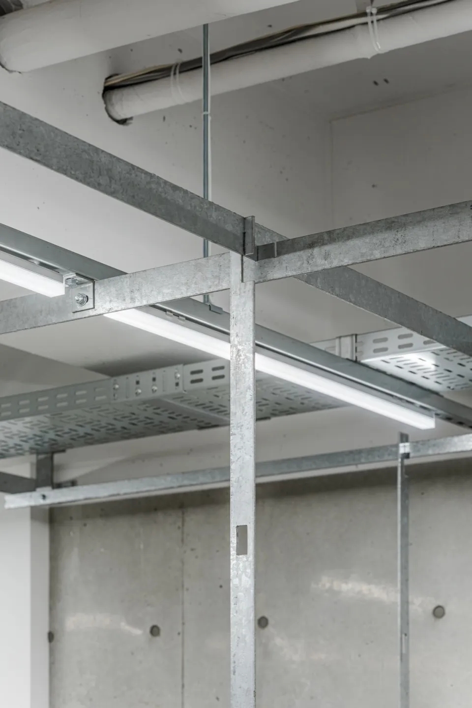 我们将两根穿孔钢扁条悬挂在天花轨道系统上,并在两根扁条之间放置一根横杆,从而设计了一个可移动的衣架,可以调节高度。此外,通过在横杆上安装搁板,该系统还可用作悬挂展示架,用于展示小件物品。
