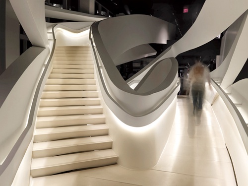 事实上,建筑的核心集中体现在楼梯的设计中,结构由热轧钢(意大利制造)制成,外面覆盖塑料表层,以突出它独特的雕塑意象。它的形体不能用任何常规的几何形体来描述,灵感来源于动力强大的漩涡,周围环绕着摆放阿玛尼商品的不同楼层。楼梯像舞动的丝带一样掠过各个楼层,这可以认为是我们对其几何形体的一种理解。每个楼层的整体布局循着不同的带状轨迹,创造了一种被漩涡控制的空间。对内部空间活力来说,没有任何元素是多余的,甚至包括外表皮。尽管建筑阵列于曼哈顿街区死板的十字相交的缝隙中,但是建筑立面通过一组发光二极管线模拟着图像和光影的运动。这个屏幕除了将室内空间投影到室外,同时还是对纽约市的特别展示,对展示其现代性和活力肩负它应有的责任。