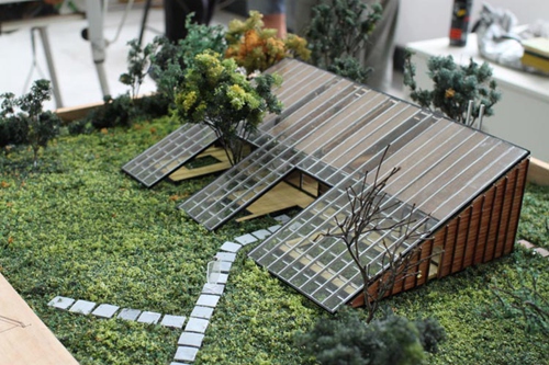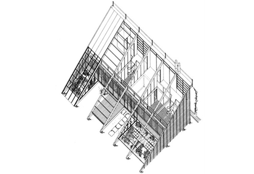 规划将基地沿着南北轴线分为四个区域:位于北面入口处,建筑围墙与攀爬植物所形成的层面之间的区域;辅助功能和休闲区域;面向南面的主要空间;以及面向花园的温室。建筑的玻璃表面在冬季可以直接利用太阳能。因此,那些常用的房间位于北部绝热性能好的较封闭的服务空间和南面能直接利用太阳能的缓冲区之间。通过可移动的玻璃隔断可使起居空间扩大至温室。厚重的楼地板和温室底部的砾石都可用于临时储存热量。在晚上,这种方式储藏的热能被释放到室内。过多的热量可通过北部实墙面的通风口释放出去。树是整个设计概念中的一个组合部分,它们在夏天提供了阴凉。