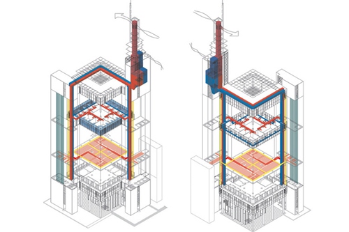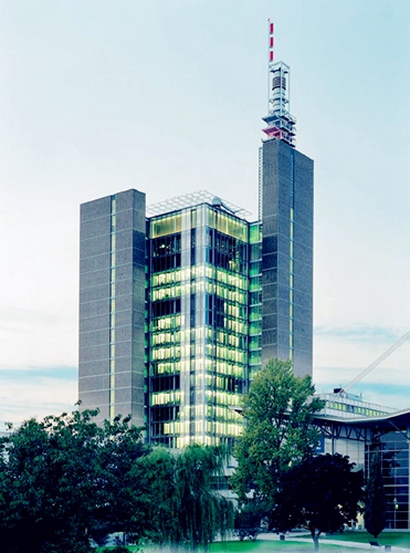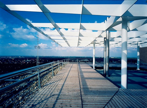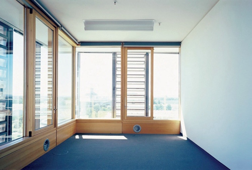 通过控制双层立面间的玻璃推拉窗,使用者能享受到清新的自然风。当窗户关闭时,新鲜空气通过内层立面上的通风管道进入室内。经过使用的空气(由于热空气上升的原理)被从上空抽出,通过中央管道系统进入热交换系统。在冬天,废气85%的热量可用于预热新鲜空气。这对于能量的高效率使用和保证内部空间舒适度有着重要意义。