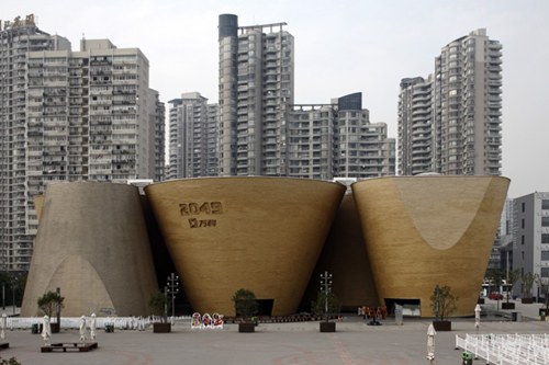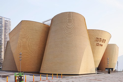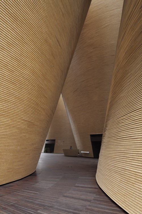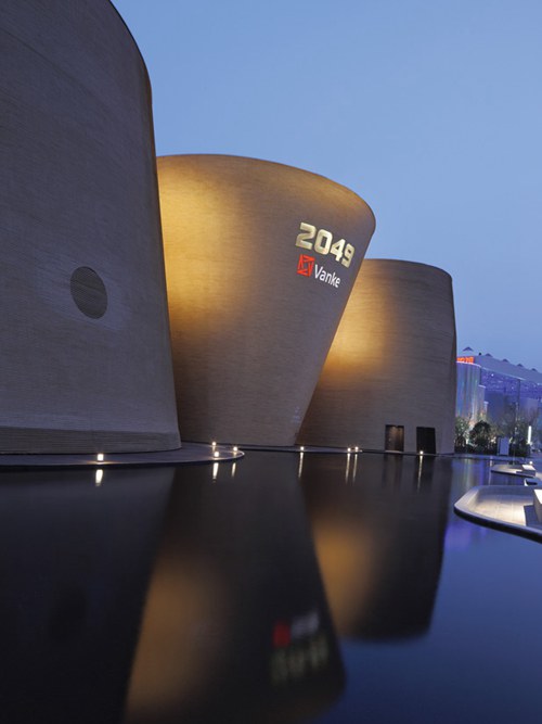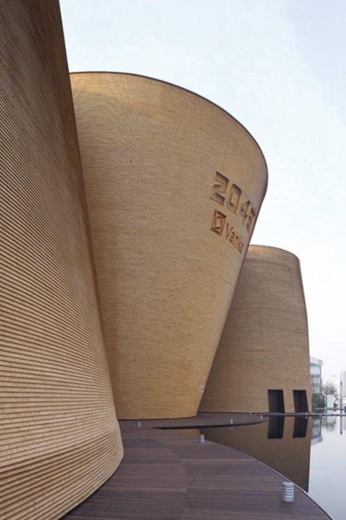 2010上海世博会万科馆昵称“麦垛”。在设计竞赛阶段,基于建筑及建材生命周期CO2排放量的研究成果,选用秸秆板作为结构材料,并以材料→结构→空间的推演为基础生成建筑的形态。最终实施的“麦垛”由表皮为秸秆板的三个正圆台与四个倒圆台交错组成,它们围合而成的半室外空间四周通透,顶部通过透明采光膜连成一体。圆台内部是独立的展厅与后勤办公空间,建筑外部环绕着景观水池。