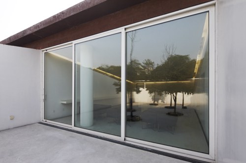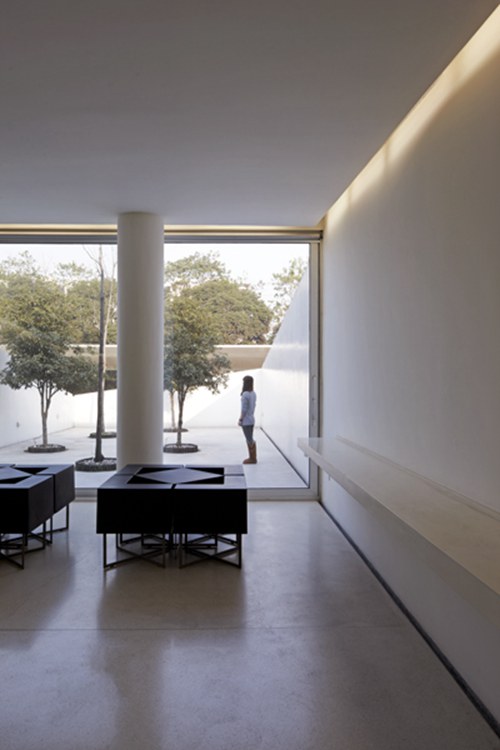 为强调蛋糕品尝区的独立性(仅有这个区域对外开放),将其看作置入进既有厂房的一个双坡屋顶房子,屋脊在厂房外墙位置,厂房外部一侧的坡屋顶掀开,仅留下围墙:贯通的室内、室外被看作是一个完整的空间,其墙面与地面的材质相同。设想在室外的树下品尝可口的蛋糕……