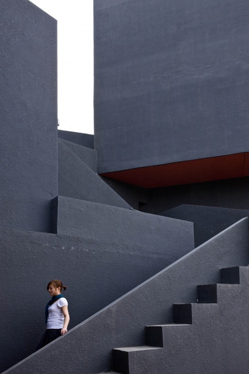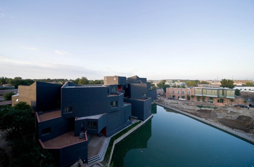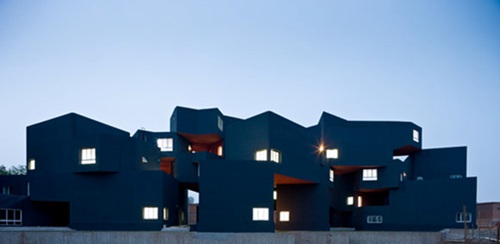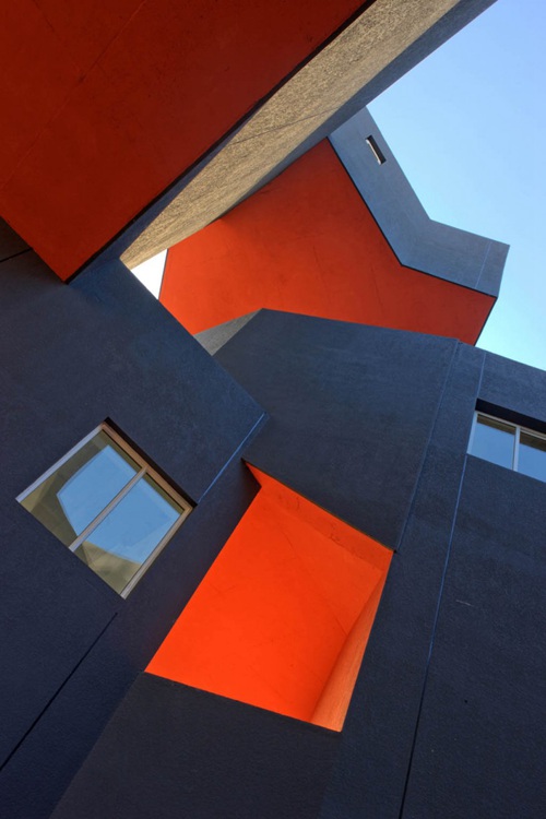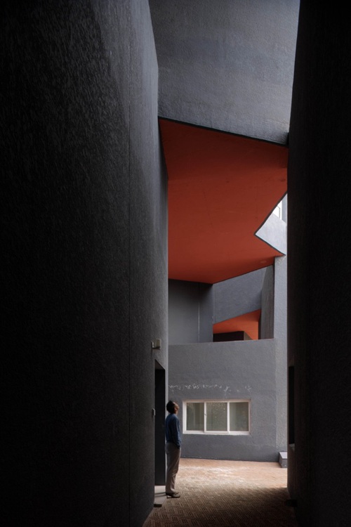 按照工作室的居住和工作两种主要功能,每一个单元都包含两种不同的尺度与组合:工作部分为6米高的简洁的方盒子,居住部分高3米,有一系列几何形空间容纳起居厨厕等功能。体量高差决定了每个单元的工作和居住功能或在同层相连或通过楼梯联系。整个建筑立面采用压型钢板,水平活动平面则是当地典型的红砖。