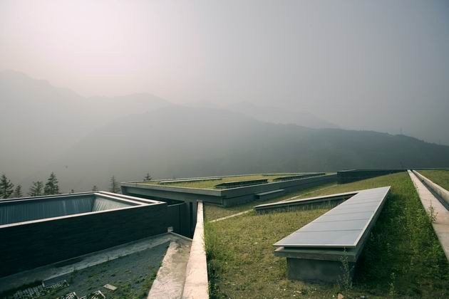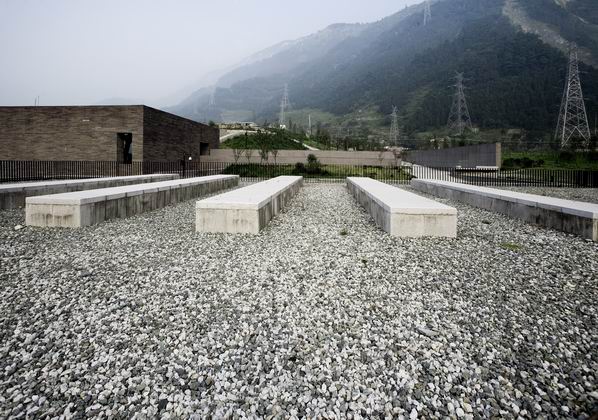 我们以植根于大地的地景式建筑为概念,来表达这大地的纪念主题,呈现一个自然、平和、静谧的纪念场所。以流水、地殇、崛起、希望为主题的四个庭院作为三大主题展厅之间的重要空间节点,分别以水、石、树、光为构成要素营造场所精神。在完整空间序列中,庭院在建筑中打开了与自然对话的窗口,为人们在参观过程中有节奏地与山体、天空、自然形成多次不同方式对话,在对话中缅怀逝者、平复心灵、思考未来。