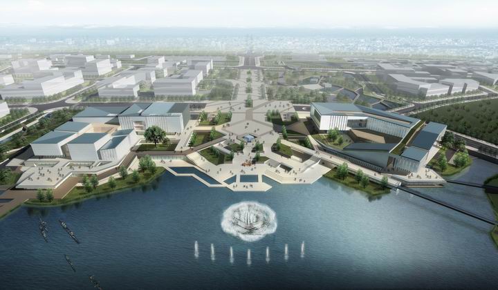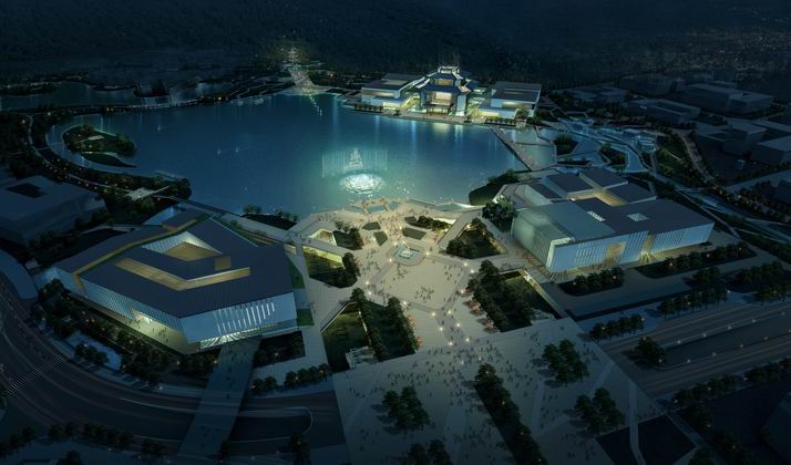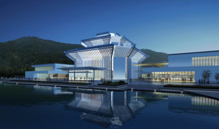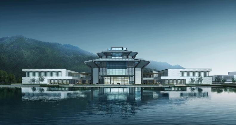 南?;峁萦赡虾;崽谩⒎珊韫莺陀形莨餐菇?。三大建筑形成品字形格局,突出会堂的主体建筑形象,与山水景观、场地环境相和谐。