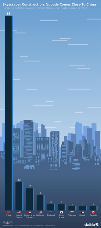 目前中国处于摩天大楼建设热潮的前沿,今年总共完成了88栋大楼的建造。