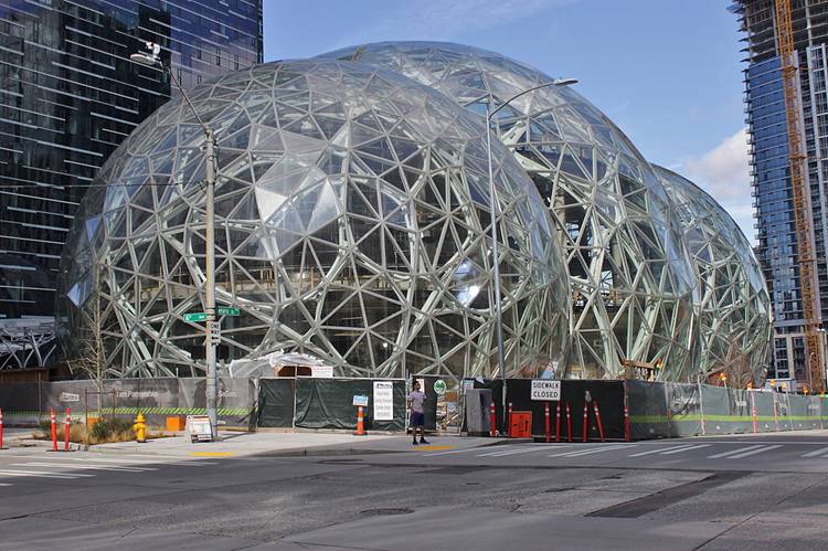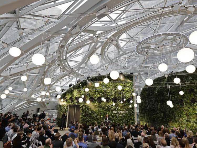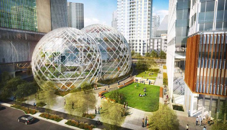 亚马逊西雅图总部由三个巨大的钢架玻璃穹顶组成,其中最高的有90英尺高,直径130英尺,由2643块玻璃面板组成。热量从面板反射出来,但允许适当的波长的光通过,以允许植物生长。
