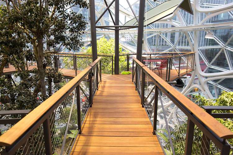 The Spheres 内部没有封闭的办公室、会议空间或办公桌,比起典型的办公室来说它更像是温室。用来取代封闭的会议室和书桌的,是步道和非传统的有椅子的会议空间。它将成为亚马逊工作人员从日常办公生活抽离出来的休憩之地。