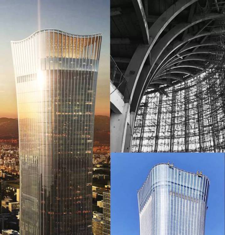 目前“中国尊”的整体形态、局部细节层次和主要空间已经显现。KPF主导的设计从原标地概念方案中仅保留了收腰式的轮廓。塔楼形体和幕墙设计从中国礼器精品中提炼了造型和装饰艺术的技巧。各层轮廓尺寸因塔楼的外形曲线变化而略有不同,自下而上自然缩小,同时顶部逐渐放大,最终形成中部略有收分的建筑造型。塔楼平面为圆角方形。塔楼宽度底部为78米,中部收分处宽度为54米,顶部宽度为69米。