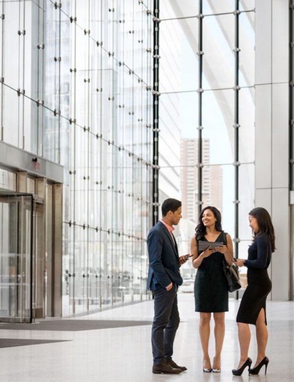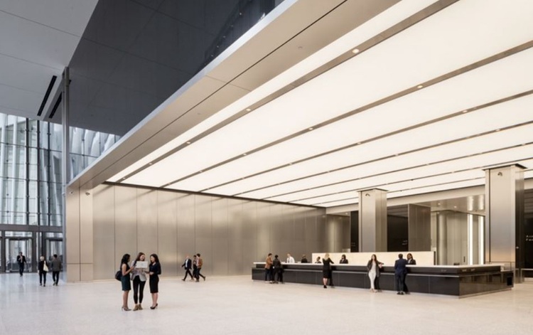 18米高的大堂由三面索网幕墙环绕,面朝 Greenwich Street, 将Cortland Way 和 Dey Street 连接起来。索网幕墙是由1.5米、宽3米长的夹层玻璃单元组成。