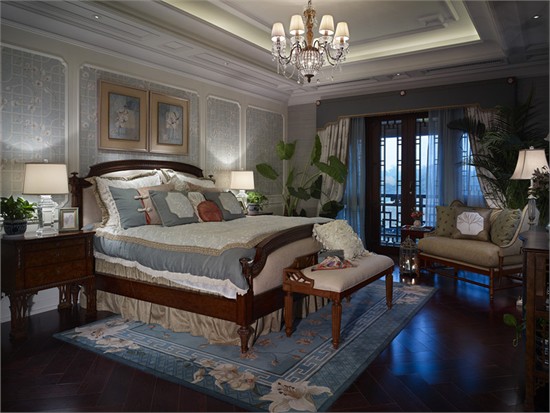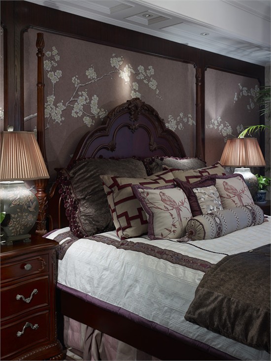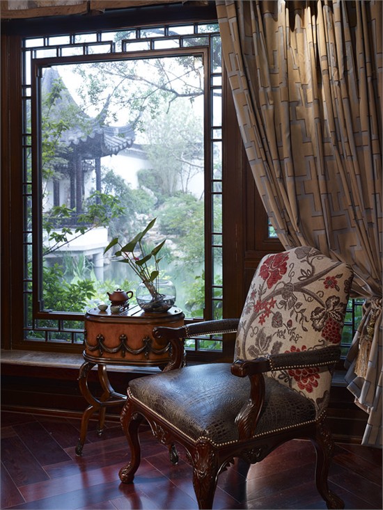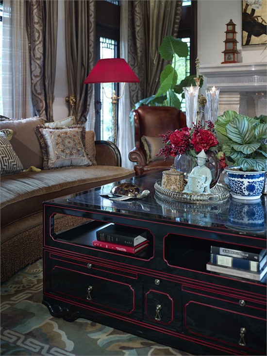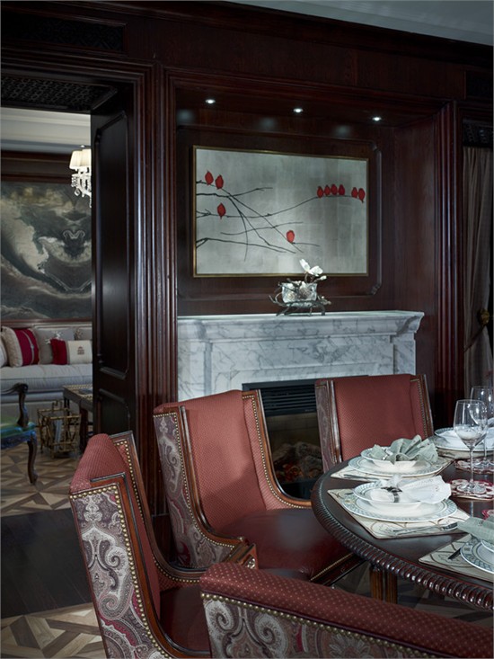 在陈设上,我们首先摒弃中式设计一定要中式陈设的惯性思维。我们认为未来的业主同样注重居住的舒适性、便利性,因此我们从国外家具资源中精挑细选了可以与我们中式装修相融合的西方家具,例如一些典型的英式风格家具就曾经受到过东方风格的影响。这些家具很自然的与我们的硬装相映衬,另外我们在布艺选择及设计制作上面同样花费大量心思,力求整体以一种恰如其分的状态呈现中式感觉。在一些重点空间,我们甚至自己设计并订制了居其自己的中式家具,以满足房子本身空间体量的要求。其他一些陈设品,诸如挂画,我们都是针对每个空间自身的表情特征,专门找美术学院的艺术家订制而成的。这种精细化的设计最终达到了软硬装极大的融合,使整个中式大宅的室内完满的以统一协调的风貌呈现出来。