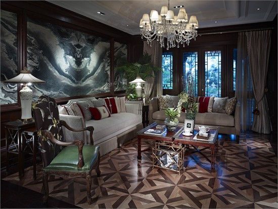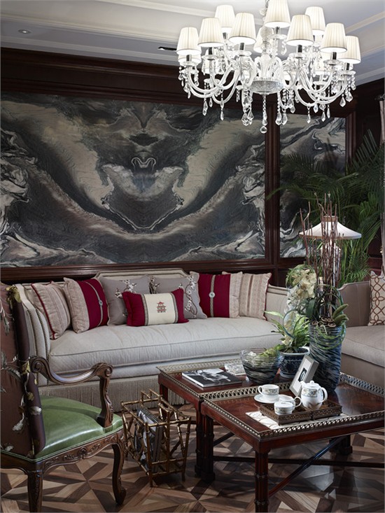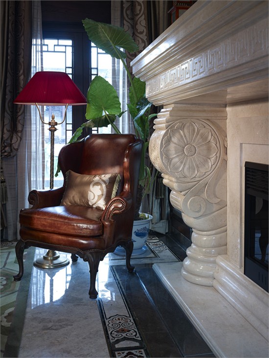 我们仔细分析研究了诸多传统的中式元素,并将之运用于欧式的硬装设计的比例原则中。在门窗套线以及护墙板的设计中,我们重新研究并总结了中国传统建筑设计中的装饰元素,并将之变形重新运用。另外,在地面石材的设计上,我们将中式传统梁架彩绘图案进行变化,运用石材水刀切割技术将之铺贴于重要空间的地面,从而产生一种极具富贵气质的震撼效果。