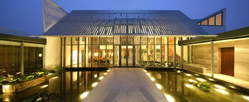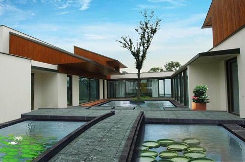 九间堂别墅将设计风格定位于现代中式,通过对中式传统建筑文化,尤其是江南水乡地区传统空间布局的深入研究,设计上以水体景观为主线,通过迂回曲折的水道和不断变化的空间收放,力求体现出小桥流水、曲径通幽的空间文化韵味。