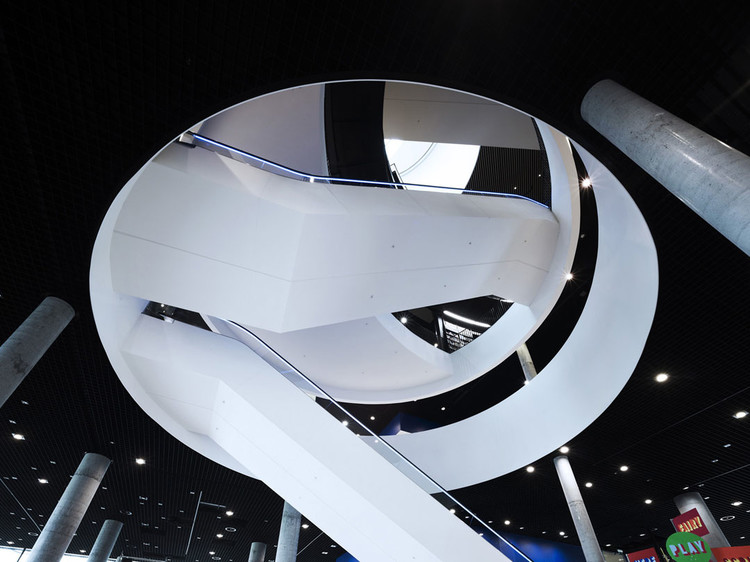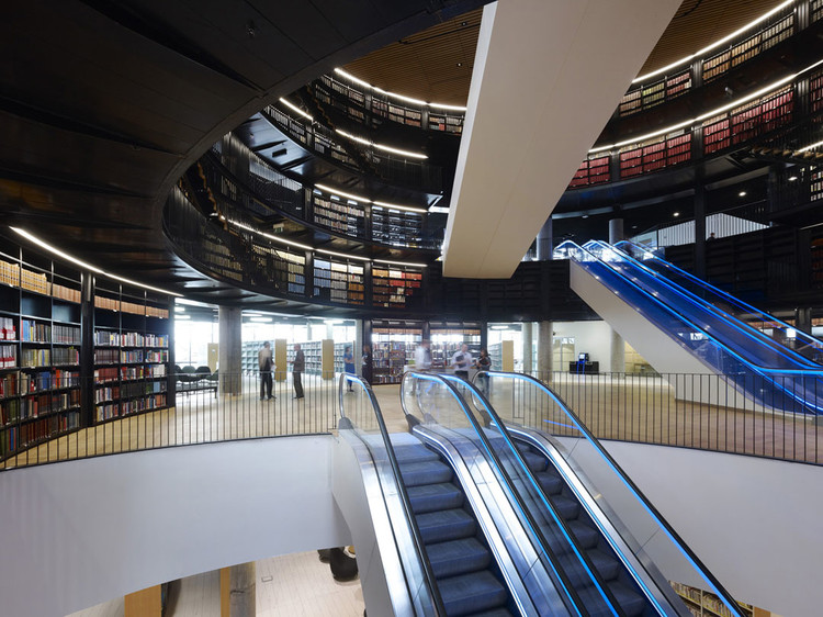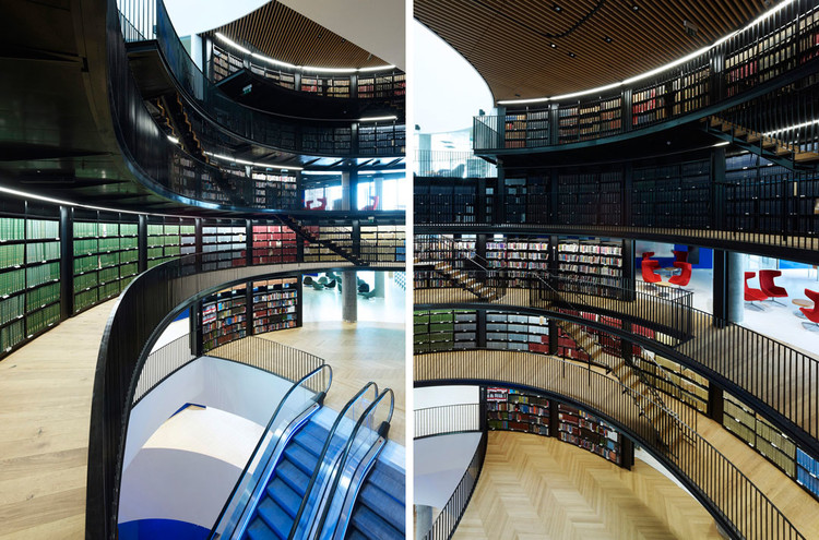 图书馆中心有一个圆形的天井,电梯和自动扶梯围绕这个公共空间放置。这个圆形的大厅不仅是图书馆的交通和公共中心,也为图书馆带来了自然采光和通风。图书馆体量之间的错叠,还形成了屋面露台,屋面露台被设计成为美丽的屋顶花园,成为城市中的大阳台。