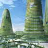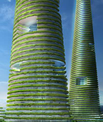 绿色城最重要的特点就是其中的众多未来派建筑和绿色环境。这种未来派建筑都是由一个个层叠的、但稍有偏移的环形结构组成。这些环形结构有两种用途,其一就是用作阳台,另一个用途就是室内公共会议或聚会场所。在未来派建筑中,既有办公室,也有住宅和购物中心,其他城市生活所必需的设施也应有尽有。此外,这些建筑还具有过滤空气和降低能耗的功能。