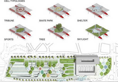 西班牙拉科鲁尼亚新的交通站将现有的终点站改建成现代多形式化枢纽站。除现有的铁路线外,这里将成为新的高速列车、城市新增公交车站和新的汽车公园的全新整合设施。老的车站是新车站的基础,新的房顶直接加盖在旧的之上。而车站大厅,车站广场以及他周边设施都可以直接通到车站的房顶,也就是波形公园。