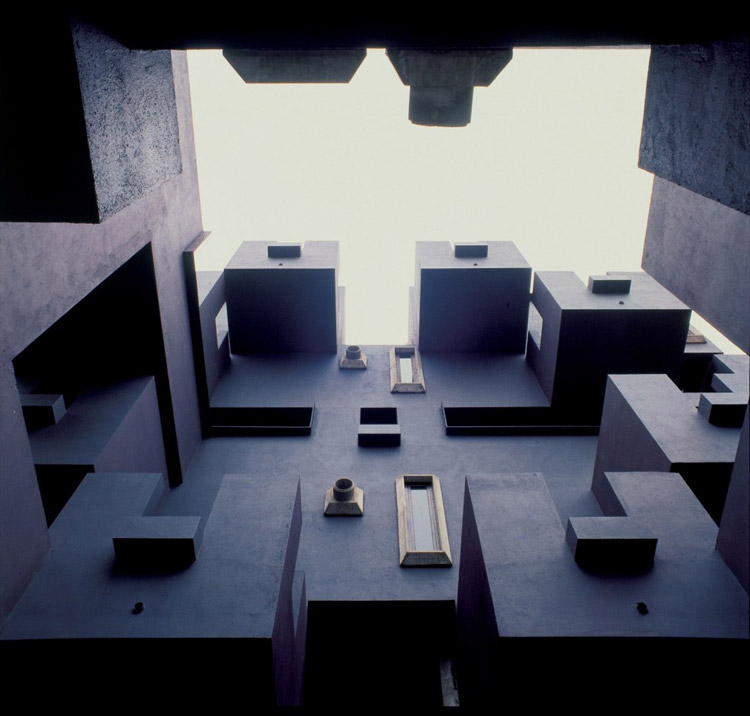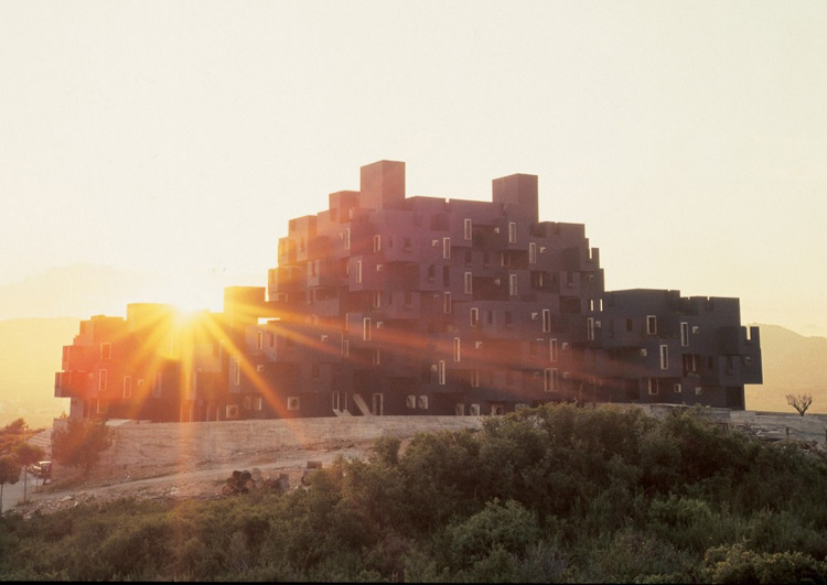 卡夫卡堡,公寓式酒店,位于西班牙塔拉贡纳和巴塞罗那之间一个海边度假胜地旁边。建筑坐落在山头,可以俯瞰到海湾,视野开阔??ǚ蚩ūな墙?榈募负巫槌伤枷朐擞糜谧≌矫娴牟铮?0个独立单元组成,每一个单元都包括起居、休息、浴室、厨房等一系列生活必须空间,另外还包括一个露台,各个单元之间相互连接,除了平面上的组织,还在垂直方向纵向发展,各单元作为一个个“插入体”和中央的垂直交通核相连。模块单元空间组合的处理既可以保持私密性,又有较好的视野。立方体组合排列整体呈现阶梯状。建筑外表面被覆以蓝色调,表达出设计者希望将建筑融入自然背景——天空的意图。