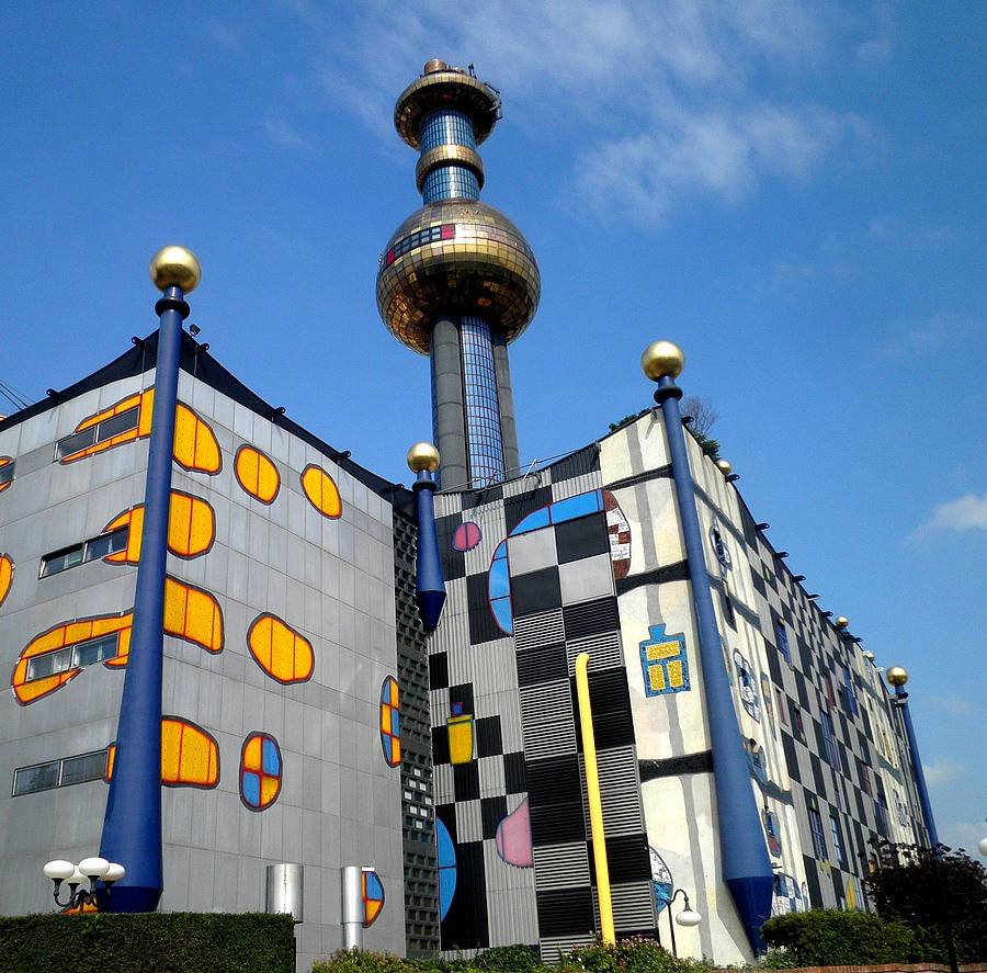 维也纳远程供热中心——1992年维也纳市内建起了一座垃圾焚烧厂,这个垃圾焚烧场充分体现环保意图变废为宝。维也纳人有意避开“垃圾”这个字眼,按功能命名它为维也纳远程供热厂。百水先生主动请缨,免费为供热装饰设计,使这个处理垃圾的场地变成了一个童话的世界。