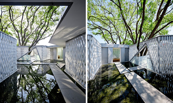 在这里,建筑的结构、材质和大树的枝干、树叶交织在一起,一起营造出一个个纯净的室内外空间。这些空间(屋和院)在时间(路径)的组织下,共同实现了时空交汇的环境体验。这是一件由建筑和自然合作完成的作品。如果人以积极的方式善待自然,也会得到自然善意的回馈。21世纪的建筑不仅要回应人的需求,更要积极担当人与环境之间的媒介。未来建筑的根本目的,是在人、自然及社会之间建立平衡而又充满生机的关联。