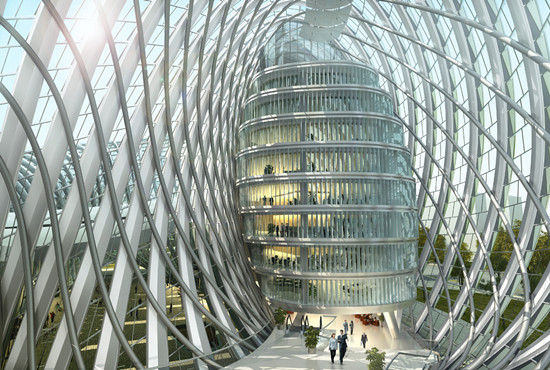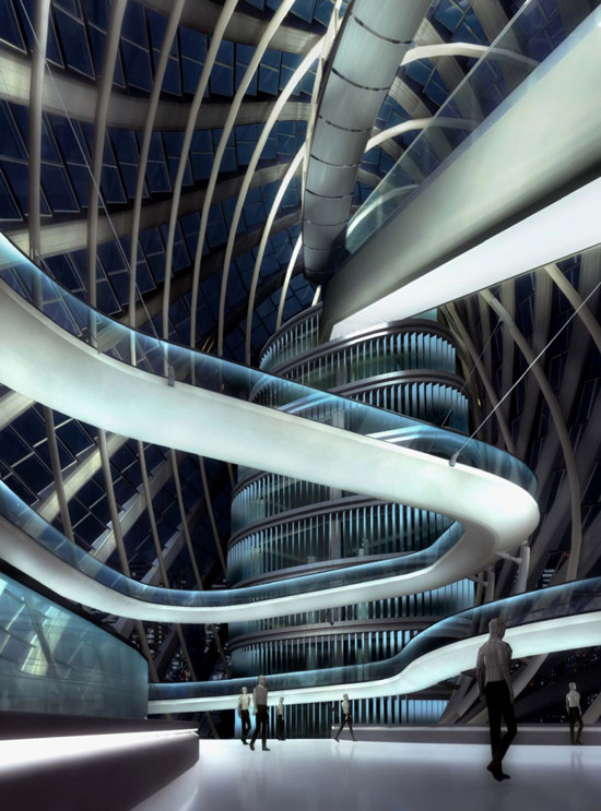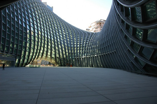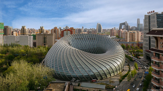 在本项目中,建筑师借助莫比乌斯圈的图解,将高层办公区和媒体演播室融合起来,在满足全方位提供节目制作场地及其他配套服务设施的同时,形成了一个完整的空间和体量,独特的建筑形态与朝阳公园自然景观有机结合为一体。