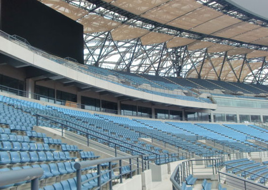 项目2011年6月竣工,2013年成功承办全运会男足甲组和女足甲组的比赛,场地有着先进的渗水系统,即使暴雨倾盆,也不会有积水。在体育场罩棚“肩”部,通过调整气枕角度,形成空气可以流动的通风口,使体育场观众更舒适地观看比赛。