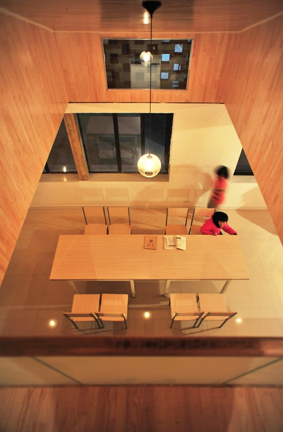 室内空间被高大的木桁架划分为两层,首层空间和阁楼空间。首层的空间布局,区别于传统的三开间方式,贯通的木质格架将首层划分为两大部分:南侧完整的大空间及其北侧的生活辅助空间。上部阁楼以木桁架作为“悬挂的墙体”对空间进行切分。