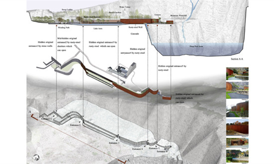 矿坑独特的空间形态为设计师营造一处不同寻常的景观提供了可能,但景观设计师同时也面临着诸多挑战。如,严重退化的生态环境和荒废的景观重建问题。最后,团队以“最小干预”、“应对采石矿坑的生态修复”及“体现东方山水意韵”为设计理念。