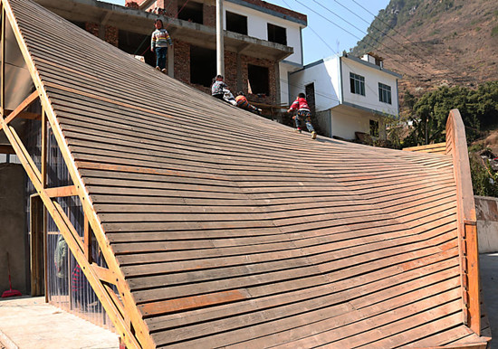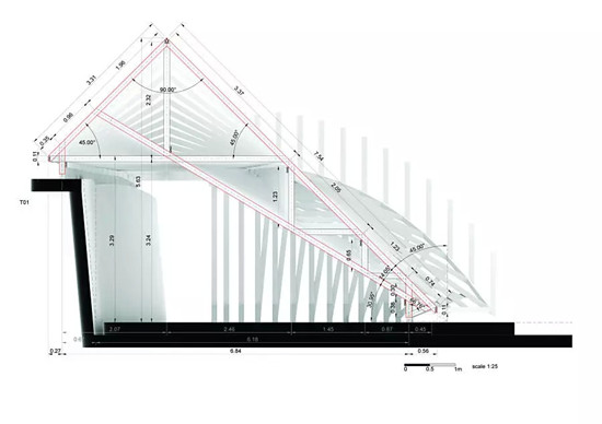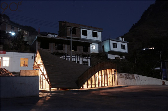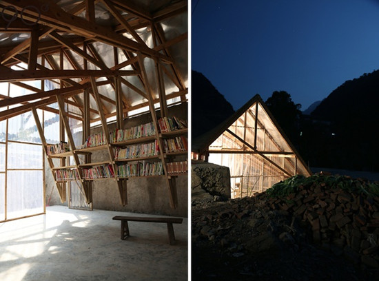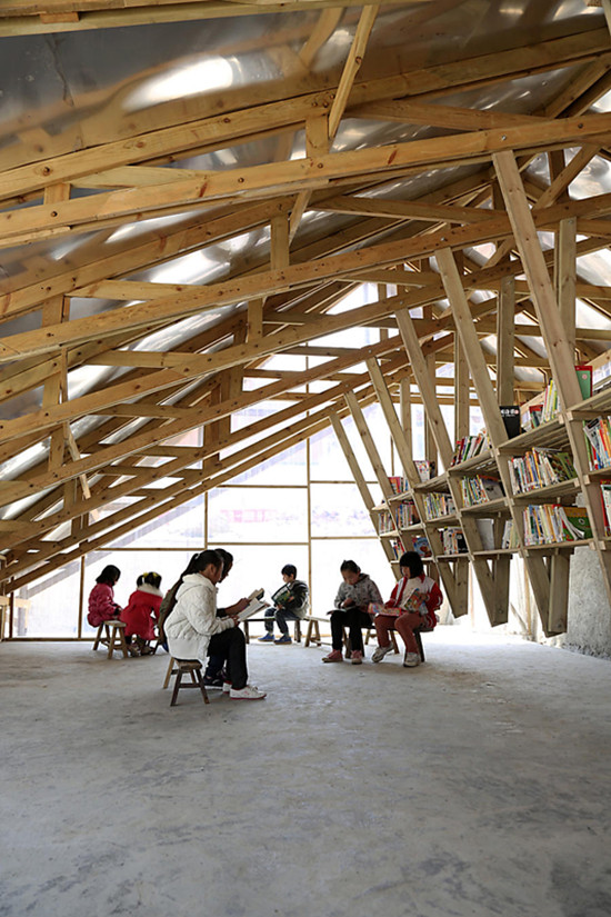 屋脊的曲线由17根不同形状的木桁架演变而成,造就了屋顶下独有的阅读空间。在室内,桁架往下延伸以支撑悬浮的书架。此项目非但没有像大多数灾后房屋重建般摒弃木结构,反而重新展示了当代木结构建筑在中国偏远地区的可行性。PINCH项目是一系列实验性建筑物之一,其中包括SWEEP项目和将于2015年初动工的新项目。此系列的项目是与当地木材厂家和建筑系学生协作并共同参与施工过程。