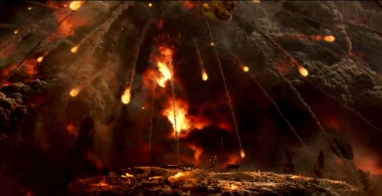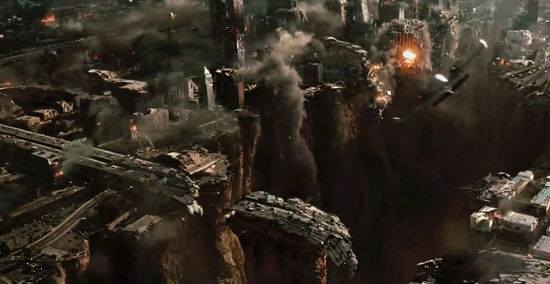 巨大的圣彼得大教堂圆顶断裂滚落,滚向无数民众集聚的圣彼得广场。影片中特意安排建筑从上帝和亚当的手中的裂缝开始破裂,这预示了人类灭亡的无奈结局。