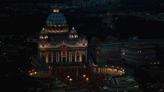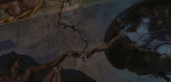 电影中,梵蒂冈一派肃穆,教皇、总统、人们手持烛光祈祷,不幸的是:天摇地动开始了,瓦砾如雨点般落下,西斯廷礼拜堂中,米开朗基罗的壁画《创世纪》开裂了,当裂缝穿过上帝和亚当之手时,人类的灭亡已经不可扭转。