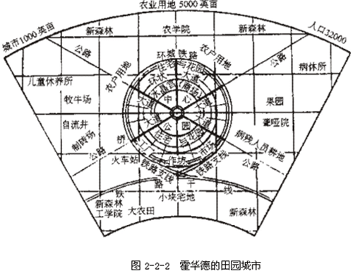 田园城市的分布是在城市中心形成公园以及博物馆、音乐厅等公共设施,向外扩展到住宅区,工业建筑分布在外环。