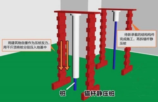 以往建筑物建造的程序是先打桩,再建造基础,最后进行上部结构的建造,而在这个地下停车场的建造中,张晖则设计采用了“逆作法”。“我利用锚杆静压桩进行基础托换,来进行地下停车场的建设。”张晖说,所谓“托换技术”,是指利用其他受力构件,临时代替原来地基基础或其他结构构件承载,待新承载的结构构件完成施工,再拆除临时受力结构构件,即完成结构托换。“通俗地讲,一个"托",新增临时性的受力结构,使之作为上部建筑的支撑;一个"换",建立新的建筑基础,再将这种临时性的结构受力拆除。”张晖说,这种托换技术的核心,是锚杆静压桩技术。