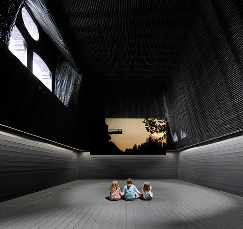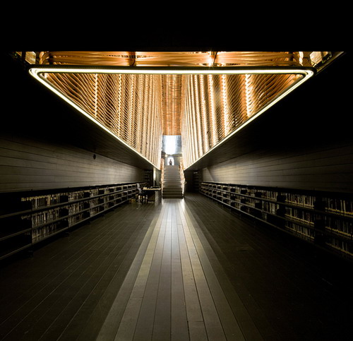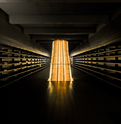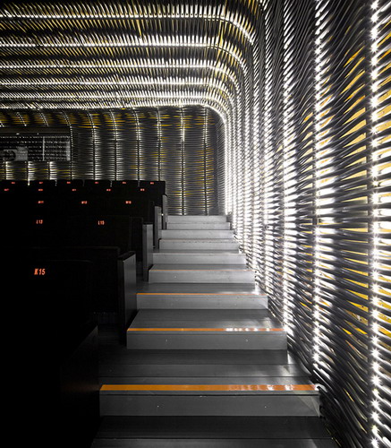 这个新的电影院Sala Azcona里面有超大的电影图书馆,还有两座电影院。整座影院黑色木头建成十分优雅沉静,而中心垂直那一条条拦杆是由塑料管组织而成,发出温暖的黄光,是整个建筑的亮点。