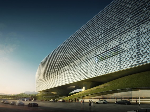 深圳光明高新园区公共服务平台就是这样一个对权力进行逆向书写的尝试。该建筑的主要功能是深圳光明高新园区的行政服务设施,也可以看作是一种政府建筑。场地的风水不错,北高南低,背后有一座名为牛山的山约60米高。整个项目占地9.4公顷,建筑面积,建筑面积16万平方米,其中一期6万平方米。我们是通过投标赢得的这个项目,从参与投标的几个方案看,建筑师们(包括国内有名的先锋建筑师)几乎清一色选择了太师椅造型来塑造整个项目,但我们却采用了不对称的“L”型布局,同时还保留了基地内被设计任务书要求推掉小山。一期主楼的设计很“大胆”,首先大楼造型是不对称的,而且我们将主体办公部分用桁架托举到空中,将底部解放出来,地面的门厅和展厅等附属设施设计为完全自由起伏的地景。