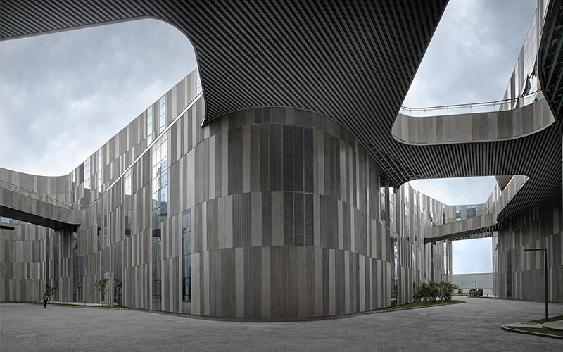 该建筑风格不同于常规的厂房建筑,外表体量规整,内部通廊的自由曲线是一种视觉符号,与爱慕的品牌特质相对应。在材料和颜色的选用上,也体现了内外有别。外部从颜色到形式上采用了一些传统厂房的语言符号,有纵向纹理的铝板幕墙和玻璃幕墙,色彩分别为深灰和浅灰。内廊则采用带有表面质感的挤塑成型水泥板,色彩上沿用内衣常用的粉色系,几种不同深度,交错排列。
