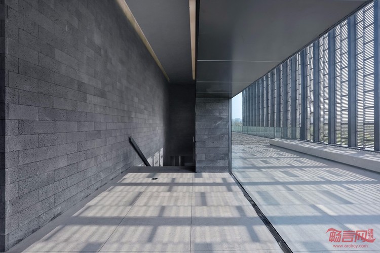 艺术馆的设计基于黑白两种主色的调和来营造淡逸朴素、纯净朦胧的意境氛围。设计上选用了黑色的洞石与淡灰色的陶棍,两者均具有朴素的质感和典雅的色泽,沉稳的基座对应一方朦胧的界面。设计选用浅灰色陶棍作为“朦胧界面”的主体材料,着重于其质朴自然的文人属性及较好的耐久性。陶棍疏密相间、组合成榀,悬垂于屋顶之下,符合所谓的“计白当黑”的意境,讲究的是有无之间的把控,与不饱满中呈现饱满的观想。