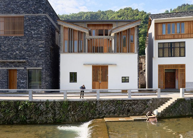 洞桥镇文村美丽宜居示范村:这是王澍主持设计的第一片农居群落。从2012年开始,他和同是建筑师的妻子陆文宇一趟趟地奔向这个名不见经传的小村庄,用灰、黄、白的三色基调,以夯土墙、抹泥墙、杭灰石墙、斩假石的外立面设计,呈现他理想中的美丽宜居乡村。屡获国际建筑大奖殊荣的王澍坦言,为村民设计农居并获得他们认可并不容易,因为这是在新型城市化的大背景下,寻回乡村传统和意义的过程。