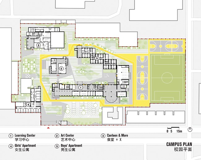 原有校园建于1980年代,密集的空间布局有机地融于周边紧凑的城市环境中。朝阳未来学校希望通过不断努力而实现的长远目标,即通过整合现有社会,经济以及环境资源,探索符合未来发展需要的全面型教育理念。我们从研究北大附中现有的课程设置与教学方法出发,思考总结与之相匹配的空间模式,来创造一个满足于每一个师生需求的乐园。