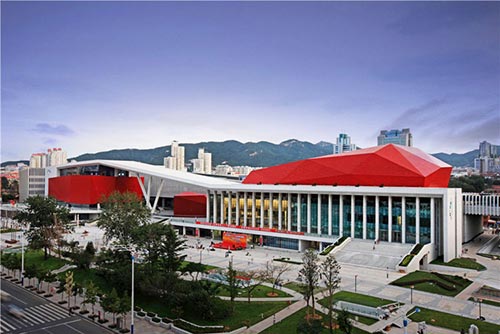 交汇之海、文化之石——将博物馆、大剧院、青少年宫的建筑体量用红色穿孔板包裹,分别意蕴历史之石、现代之石和未来之石。洗练简洁而寓意深刻的形体下包含了丰富、多层次的内外部空间,形成山海仙境、开放烟台和交汇之海、文化之石的设计意向。